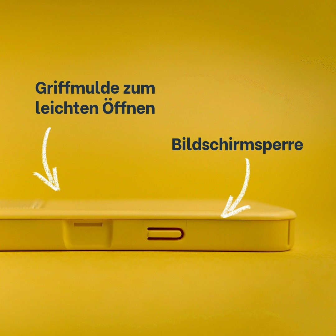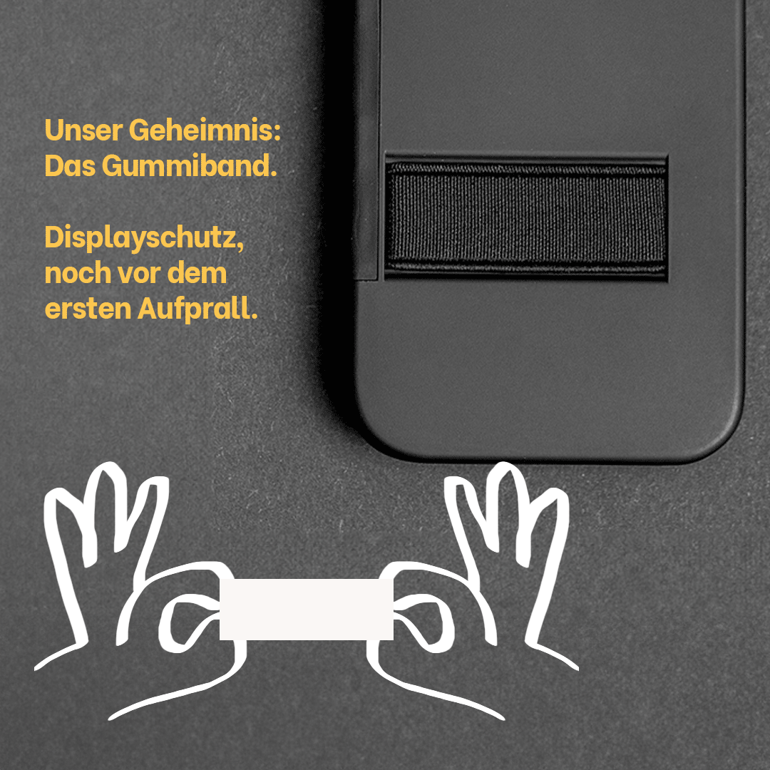 Det elastiska bandet är den absoluta höjdpunkten i vårt fodral - det aktiverar skyddsmekanismen på ett genialt sätt! När det inte används förblir det avslappnat, men så snart du öppnar fodralet helt sträcker det sig upp. Och här kommer kicken: om din Klak faller, dras bandet åt blixtsnabbt och locket snäpper igen omedelbart! Det här högteknologiska gummibandet är inte bara extremt elastiskt, utan också superhållbart och av högsta kvalitet. Det är helt enkelt den osynliga hjälten som håller din smartphone säkert på plats!